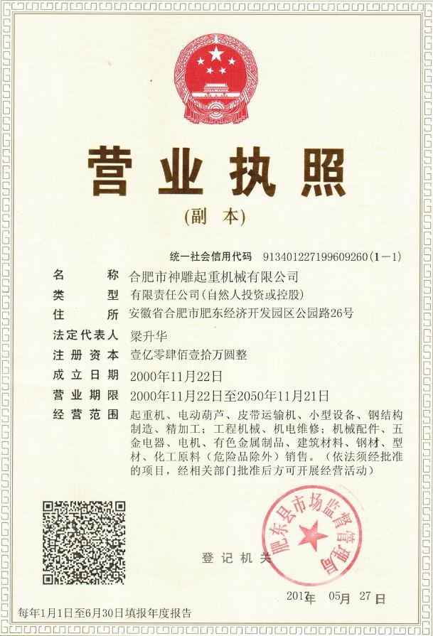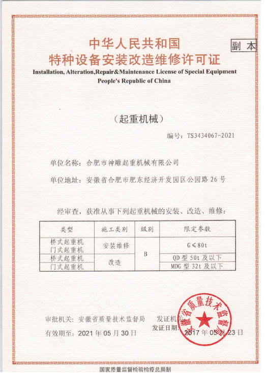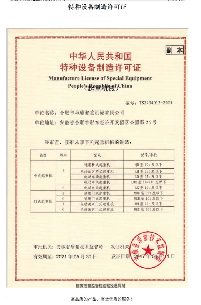 合肥神雕起重機械有限公司是股份制企業,位于合肥東部經濟開發區公園路848號.占地面積2萬多平方米,建筑面積約一萬平方米.現有職工480余人,其中高級技工43人,中、高級技術人員28人.產品經ISO9001:2000認證,國家級生產許可證認證,生產神起牌電動單梁起重機,橋式雙梁起重機、門式起重機、抓斗式等分列起重機,生產能力達到年產3000臺,年產值過億元. 公司堅持奉行“關注顧客,追求卓越,誠 ...